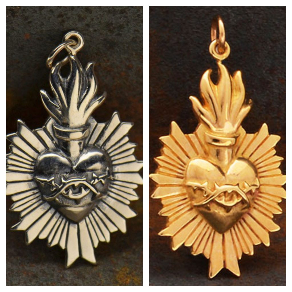 Within the Catholic faith, the sacred heart is a medieval symbol of Christ’s sacrifice. It signifies the redeeming love of God as the source of illumination and happiness. This radiant design is romantic and fierce with beautiful detailing on the thorns and rays of light. Wear it close to your own heart as a comforting reminder of faith.