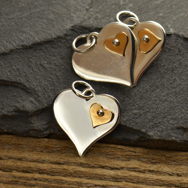 Sterling Silver Heart with Riveted Bronze Heart Charm. A gorgeous combination of silver and bronze comes together in this sweet design. A medium silver heart is the base for a tiny natural bronze heart. These are riveted together, the bronze heart swings free, for a modern look. Wear it alone or in a collection of other charms for a fun, flirty look.