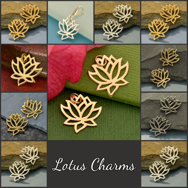 Lotus Charms. Considered by many as the most beautiful flower in the world, the lotus blossom has come to symbolize enlightenment, serenity, and determination to grow strong under any circumstance. One of our all time best sellers, this silver charm is lovely on earrings, necklaces and bracelets. It is ultra versatile. Try stringing to various points among the open work petals for a fresh look