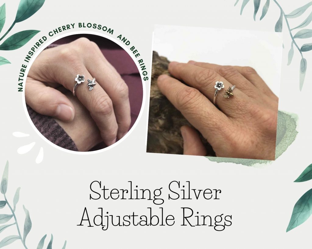 This adjustable ring features a sterling silver band and cherry blossom flower and either a sterling silver or natural bronze honeybee.