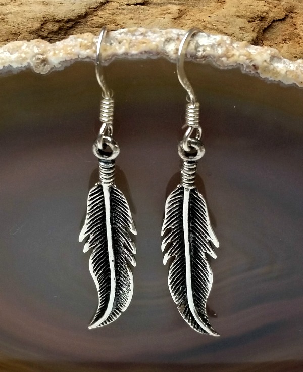Sterling Silver Large Feather Earrings. Simply gorgeous detailed feather earrings. Feathers mean a lot to Native American Tribes. A feather isn’t just something that falls out of a bird, it means much more. The feather symbolizes trust, honor, strength, wisdom, power, freedom and many more things. … Many Indians believe that if they are given this feather, it is a symbol from above. If any Indian is given Golden or Bald Eagle feathers it is one of the most rewarding items they can ever be handed. Indians believe that eagles have a special connection with the heavens since they fly so high. Many Indians believe that if they are given this feather, it is a symbol from above. They believe that the eagle is the leader of all birds, because it flies as high as it does and sees better than all the birds. Once an Indian receives a feather he must take care of it, and many will hang it up in their homes. It is disrespectful to hide it away in a drawer or a closet. An Indian will be given a feather to hold on to or to wear, and if they hold it they must put it out for everyone to see. This will be a constant reminder of how to behave. An eagle feather is a lot like the American flag, it must be handled with care and can never be dropped on the ground.