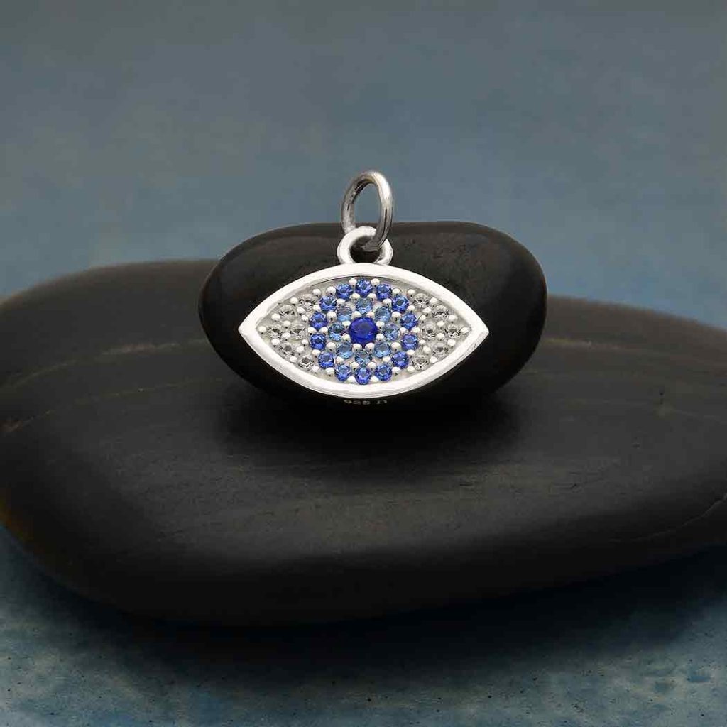 Add a modern vibe to your jewelry line with this sterling silver pave set nano gem eye charm. It’s various shades of blue ripple like light off the Aegean sea in this modern evil eye charm.